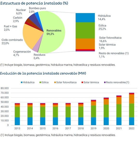 La buena noticia es que el Plan afronta actualmente su primera revisión al alza, pues ya se superan las expectativas marcadas: el parque de generación con fuentes de energía renovables en España a finales de 2022 ascendió a 70.452 MW, registrando el valor máximo histórico, y con él se ha producido el 42,2 % de la generación total según datos de Red Eléctrica Española (REE).