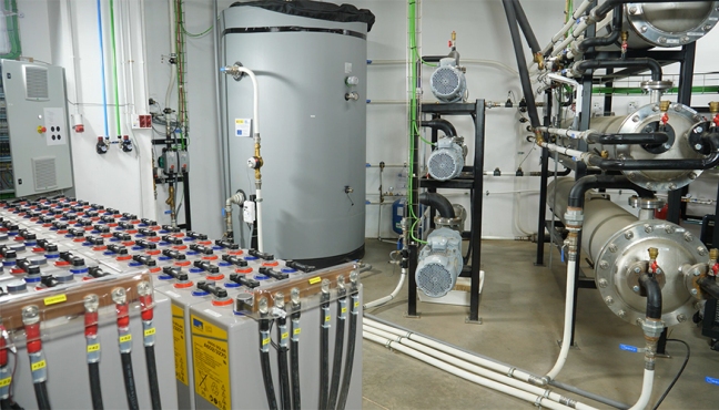 Por otro lado, el calor residual generado por el electrolizador se almacena en los depósitos para unirse a la calefacción del edificio. La instalación de la bomba de calor geotérmica, que se alimenta de la electricidad producida por la propia microrred, produce calor en invierno y frío en verano con rendimientos muy elevados. Además, la acumulación térmica permite priorizar el funcionamiento de la bomba de calor cuando la producción eléctrica es más económica (producción fotovoltaica directa), almacenando el calor para utilizarlo cuando la producción eléctrica sea más cara (por ejemplo, utilizando el hidrógeno acumulado previamente en la pila de combustible).