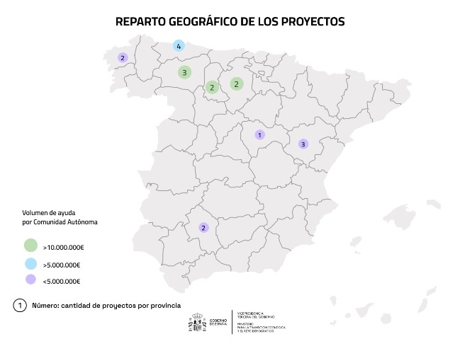 Como resultado del proceso de evaluación, en el que han participado las comunidades autónomas, la Federación Española de Municipios y Provincias (FEMP), el MITECO, las diputaciones provinciales y el propio ITJ, se adjudican las ayudas a 19 proyectos repartidos en 11 Convenios de Transición Justa de seis comunidades distintas.