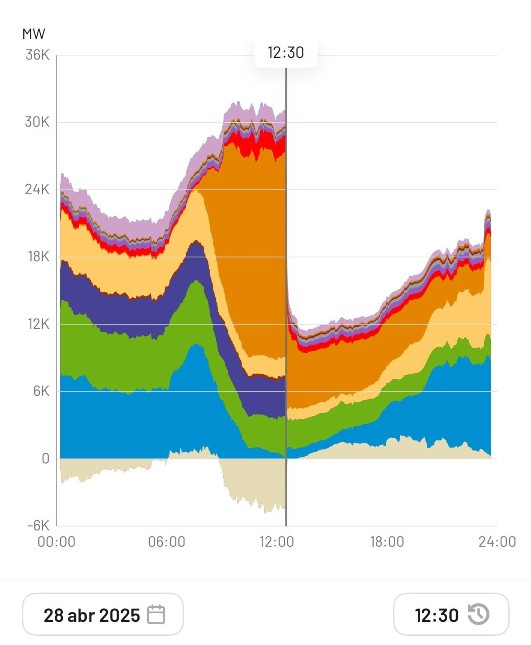 El 28 de abril de 2025 mostró un perfil eléctrico muy característico de un día primaveral en España, con cielos despejados y una fuerte presencia de energías renovables, especialmente la solar. La gráfica de generación y demanda de ese día muestra con claridad cómo se comporta el sistema eléctrico en un contexto de transición energética, en el que las fuentes limpias tienen un peso creciente pero aún requieren respaldo en determinadas franjas horarias. Sin embargo, este día se produjo un colapso casi instantáneo del sistema eléctrico, que sorprendió por su magnitud.