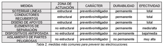 En la Tabla 2 se representa un resumen de las medidas más comunes para prevenir o mitigar las electrocuciones, junto con su eficacia y otras características.