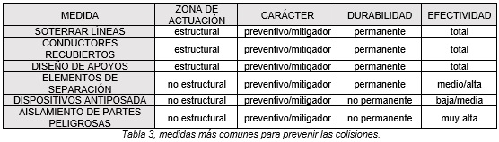 En Tabla 3 se representa un resumen de las medidas más comunes para prevenir o mitigar la colisión de las aves, junto con su eficacia y otras características.